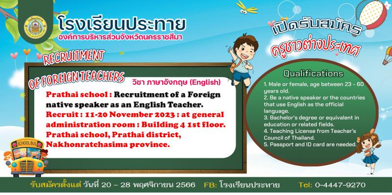 รับสมัครครูชาวต่างประเทศ วิชาภาษาอังกฤษ Recruitment of foreign teachers ระหว่างวันที่ 20 - 28 พฤศจิก..